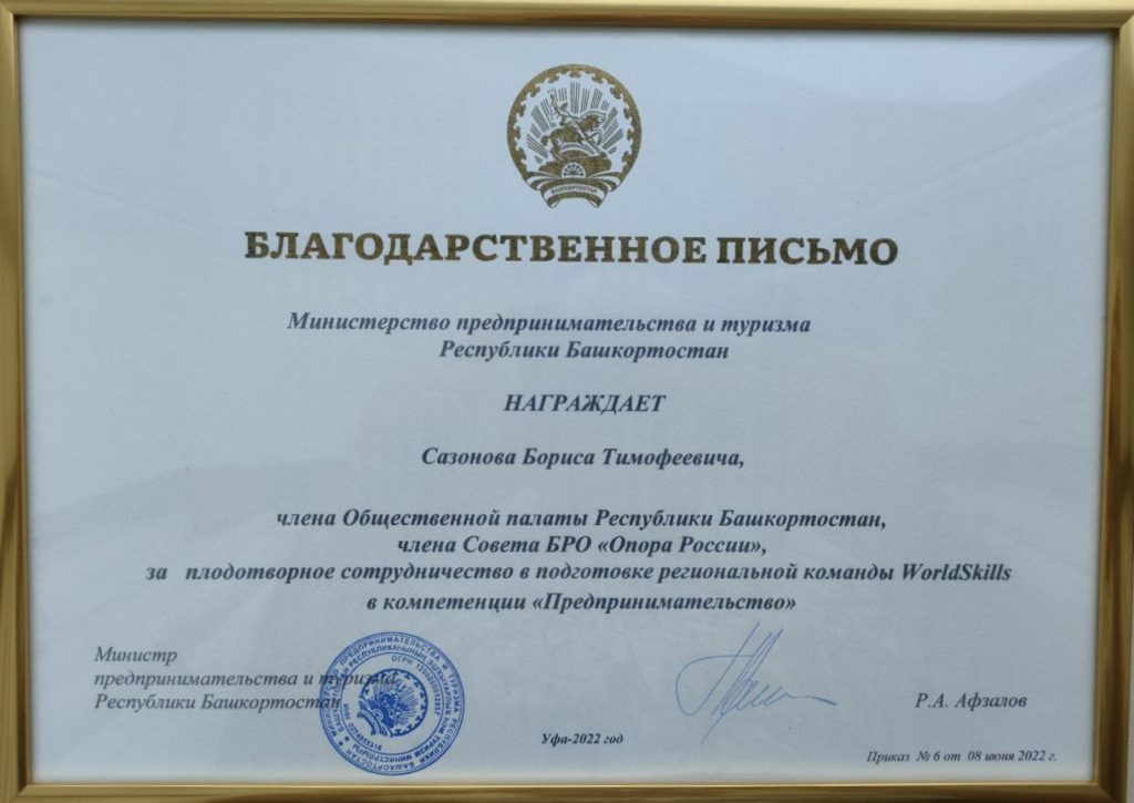 От Министерства предпринимательства и туризма Республики Башкортостан Благодарственное письмо за плодотворное сотрудничество в подкотовке региональной команды WorldSkills в компетенции «Предпринимательство».