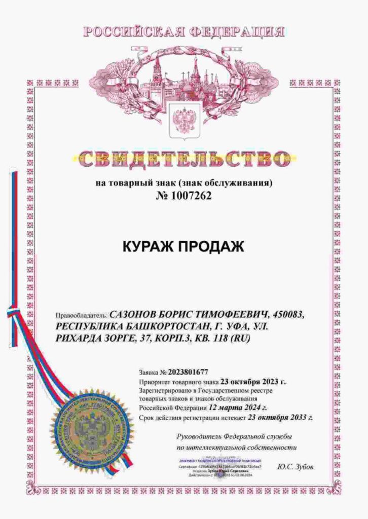 От Федеральной службы по интеллектуальной собственности Свидетельство на товарный знак (знак обслуживания) «Кураж Продаж».